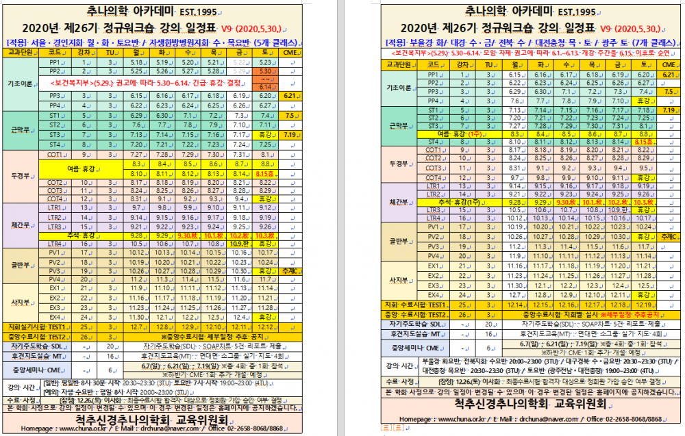 ☞ 20.5.29.(금요일) 現 시점부터~6.14.(토요일)까지 보건의료관련 기관의 개최 여정인 행사는 자체 하라는 보건복지부의 권고에 따라 척추신경추나의학회의 <추나의학아카데미>관련 전국의 강의 일정을 아래와 같이 다시 조정되었음을 알려드립니다. =><강의일정표>(V9) 2020.5.30. 참조
